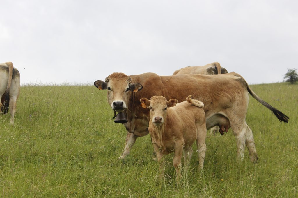 Hier, nous avons été visiter l’exploitation de Sylvain, un éleveur bovin dans l’Aveyron. Ses vaches sont élevées sur les plateaux de l’Aubrac. Avec une exploitation située à près de 1000m d’altitude, ses animaux bénéficient d’une herbe de haute qualité issue des prairies naturelles d’altitude de la région. Cette alimentation est complétée par un mélange de céréales marqué par l’absence totale d’OGM et de maïs ensilé. Son cheptel est composé uniquement de mères aubracs pures. Il élève alors des veaux aubrac purs et croisés charolais directement sous leur mère.